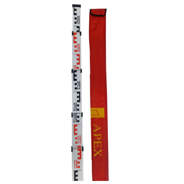 Estadal de Aluminio de 4 Metros con funda de nylon. Incluye niveleta para Estadal. Graduación de lectura en E al frente y milimétrica en la parte posterior.