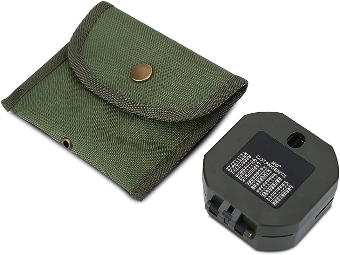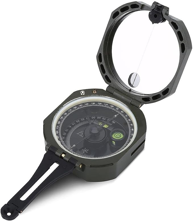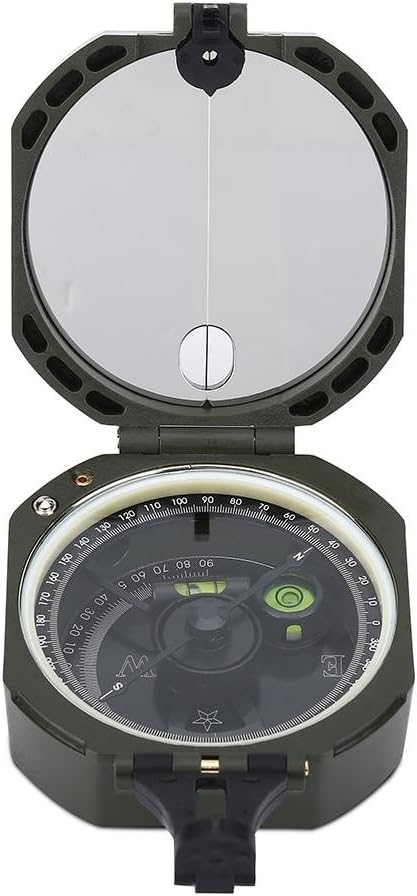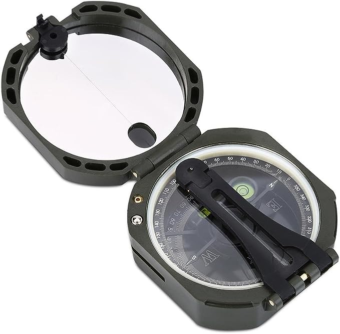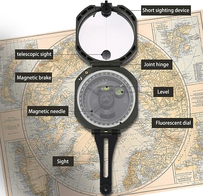 Esta brújula está equipada con una mesa de referencia (en la base), espejo de visión, agujero de visión, puntos de visión ajustables, línea de vista, nivel de burbujas y nivel de clínicómetro.