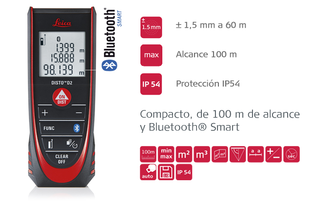 Leica disto D2. • Tecnología Power Range. • IP54 protección contra polvo y chorros de agua. • Pantalla iluminada de 3 líneas. • Extremo multifuncional automático.